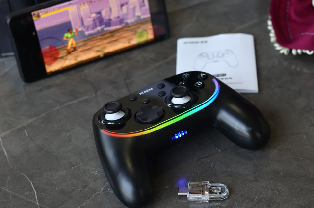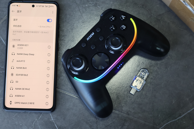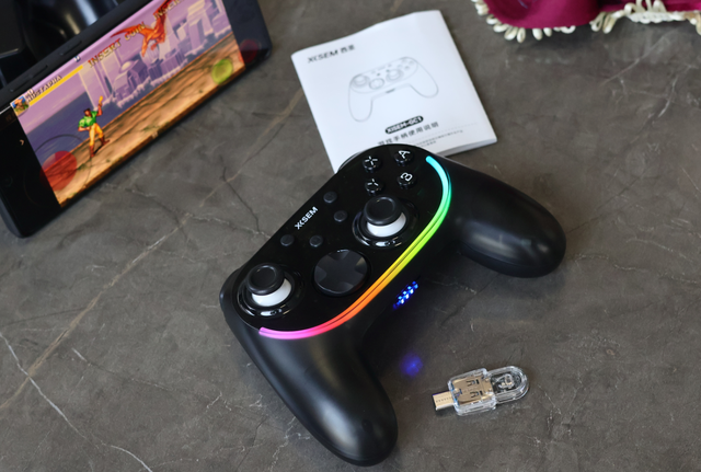 西圣 GC1 的包装挺朴实,没有花里胡哨的电竞风,打开就是嵌在模具里的黑色手柄,沉稳又低调。但开机瞬间我就被惊艳到了 —— 背面的 RGB 灯带亮起,10 种灯效可以通过独立按键切换,亮度还能调节,深夜玩游戏时氛围感直接拉满,放在桌面当摆件都不违和。
