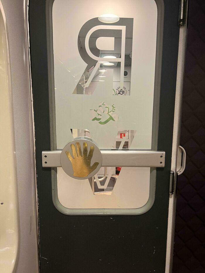 25. 这列火车的门上有着六个手指的手印,让人不禁好奇它们的故事。