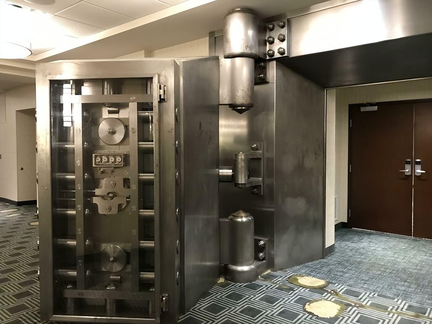 20. 这个巨大的保险库门,厚度惊人,重达40吨,给人一种坚不可摧的感觉。