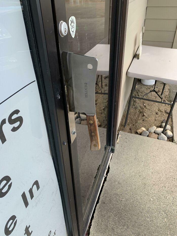 34. 肉铺的门把手设计独特,竟然是一把锋利的屠刀,让人不禁对这家店的专业性印象深刻。