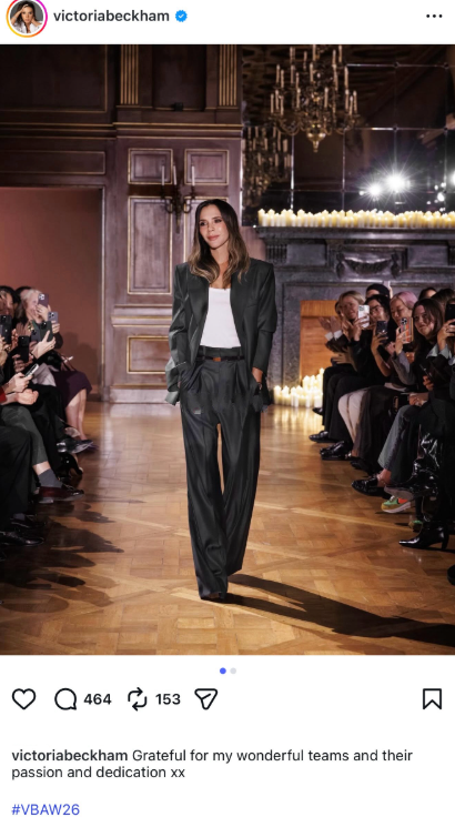 除了家人合照,贝嫂还晒出自己的出场照;只见她穿着自己设计的西服套装,内搭白色打底衫,走在T台上好似高冷女总裁,这样的维多利亚又酷又飒!