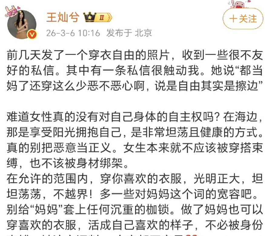 3月6日,王灿的一条发文,瞬间点燃全网情绪——一向温和的她,罕见气得发文怒怼网友,字里行间满是委屈与愤怒。起因是她分享了一组海边写真,主打穿衣自由,却被网友私信恶意攻击:“都当妈了还穿那么少,恶不恶心啊,说是自由其实是擦边。” 这番刺耳的言论,不仅刺痛了王灿,更引发了全网对“当妈后是否有穿衣自由”的激烈讨论。