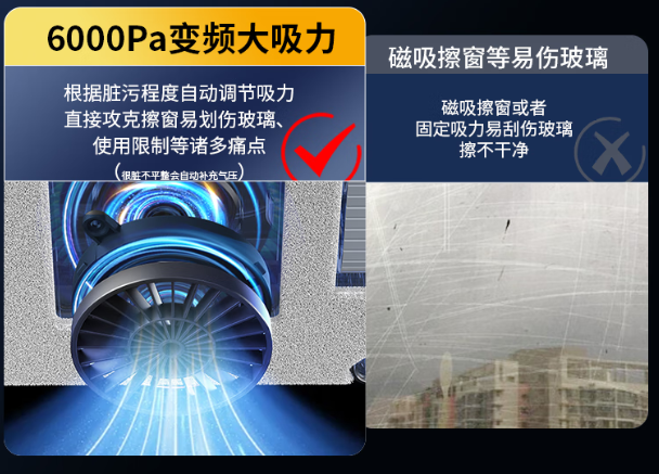 它的风机吸附力达3000Pa,而且采用了变频自调节技术,如果漏气,吸力低于3000Pa,风机会瞬间补压,让吸力始终保持在3000Pa,让机器一直牢牢吸附在玻璃上。稍有不足虽然对旋提升了效率,但双盘结构可能导致机器在角落的扭动灵活性受限,边角清洁能力并未有质的飞跃。