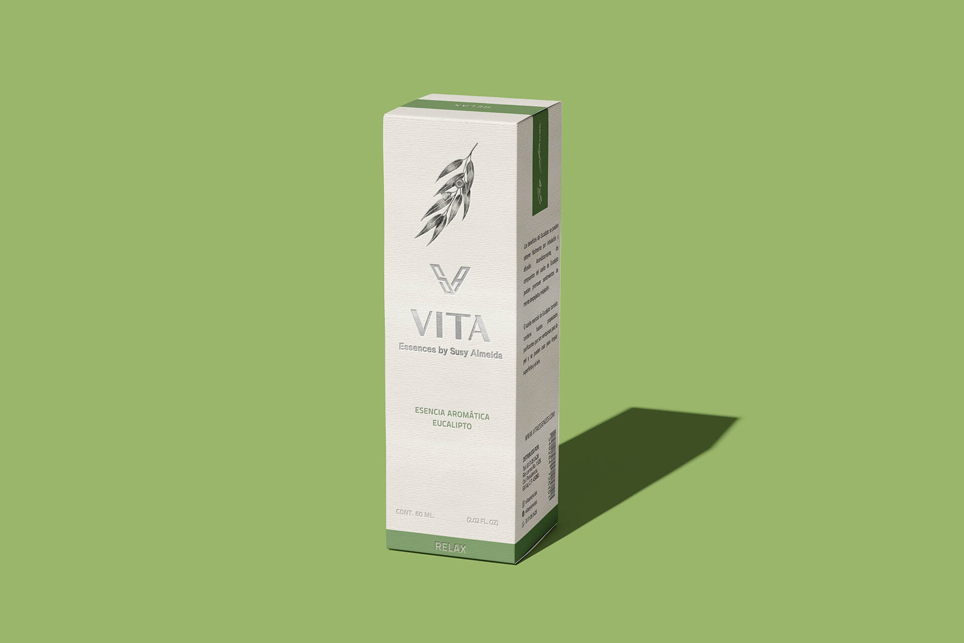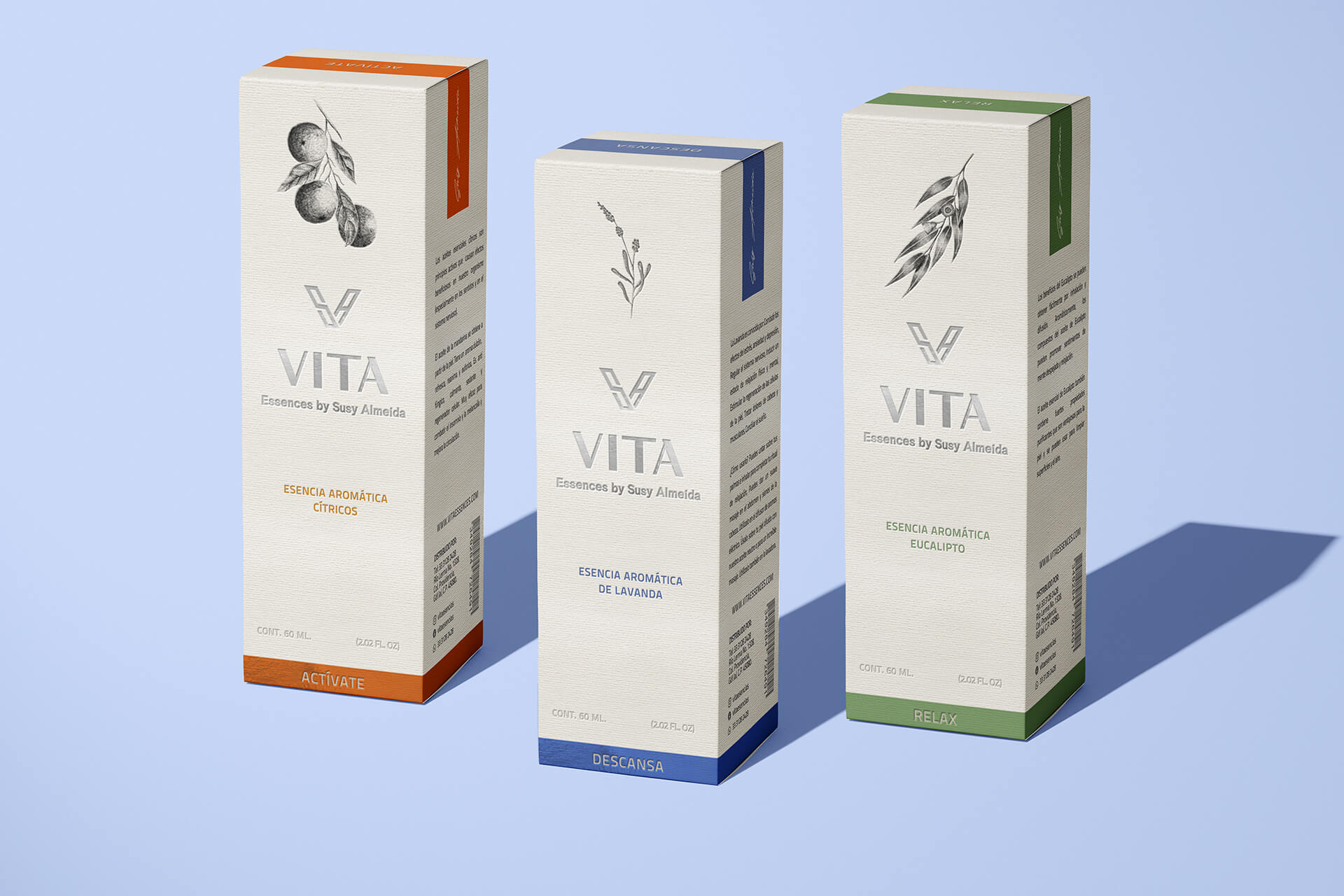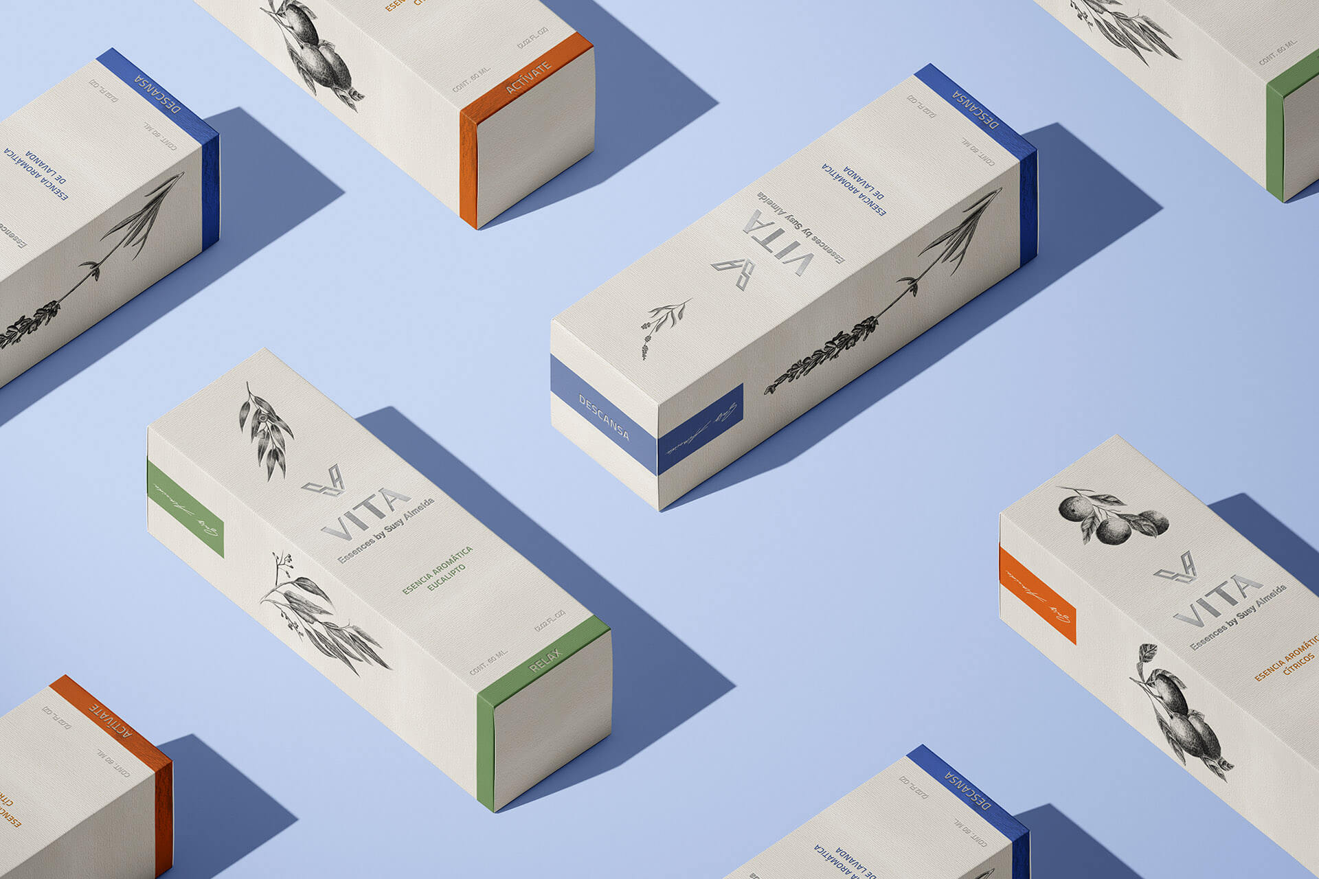 包装上的植物图案采用了黑白线条绘制,简洁而富有艺术感。橄榄、薰衣草等植物图案与香气相呼应,让消费者仅看包装就能联想到系列的天然成分和独特香味。文字设计上,“VITA”名称以简洁的字体呈现,下方“Essences by Susy Almeida”的字样则增添了一份专业与精致感。不同功能的系列通过不同颜色的色块和对应的文字标识来区分,如“ACTIVATE”“DESCANSA”“RELAX”,清晰明了,方便使用者快速找到自己需要的用品。