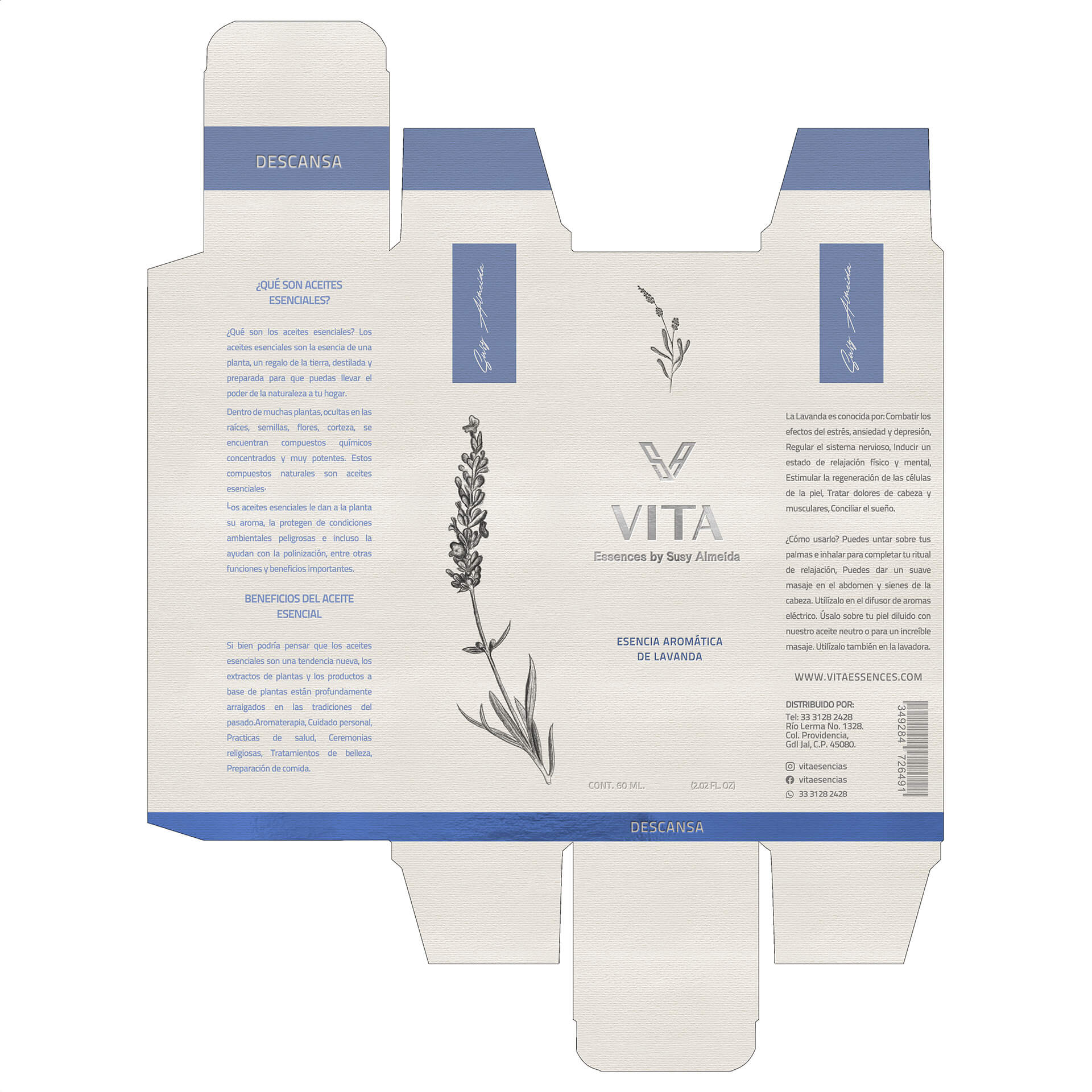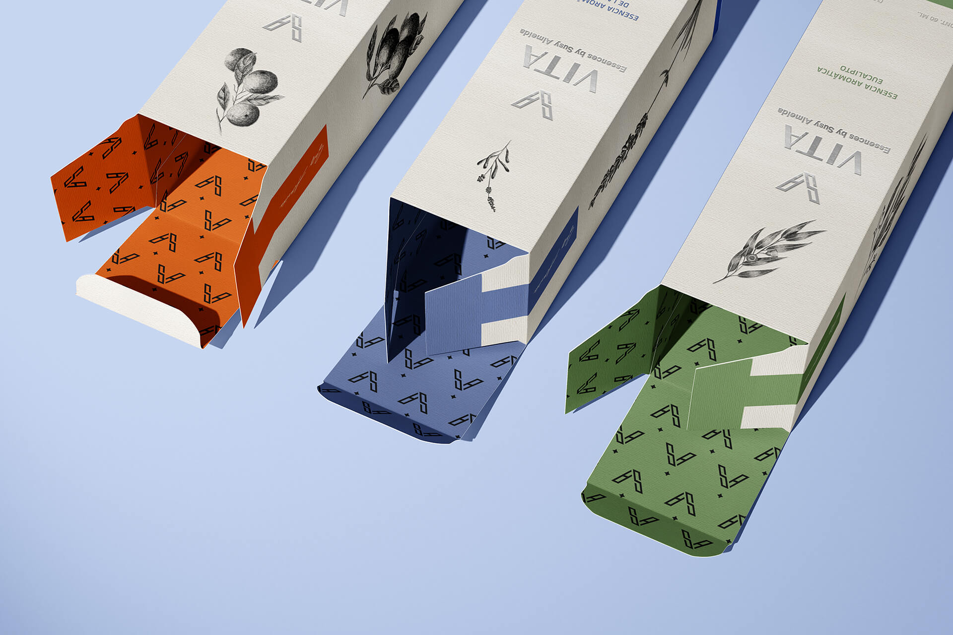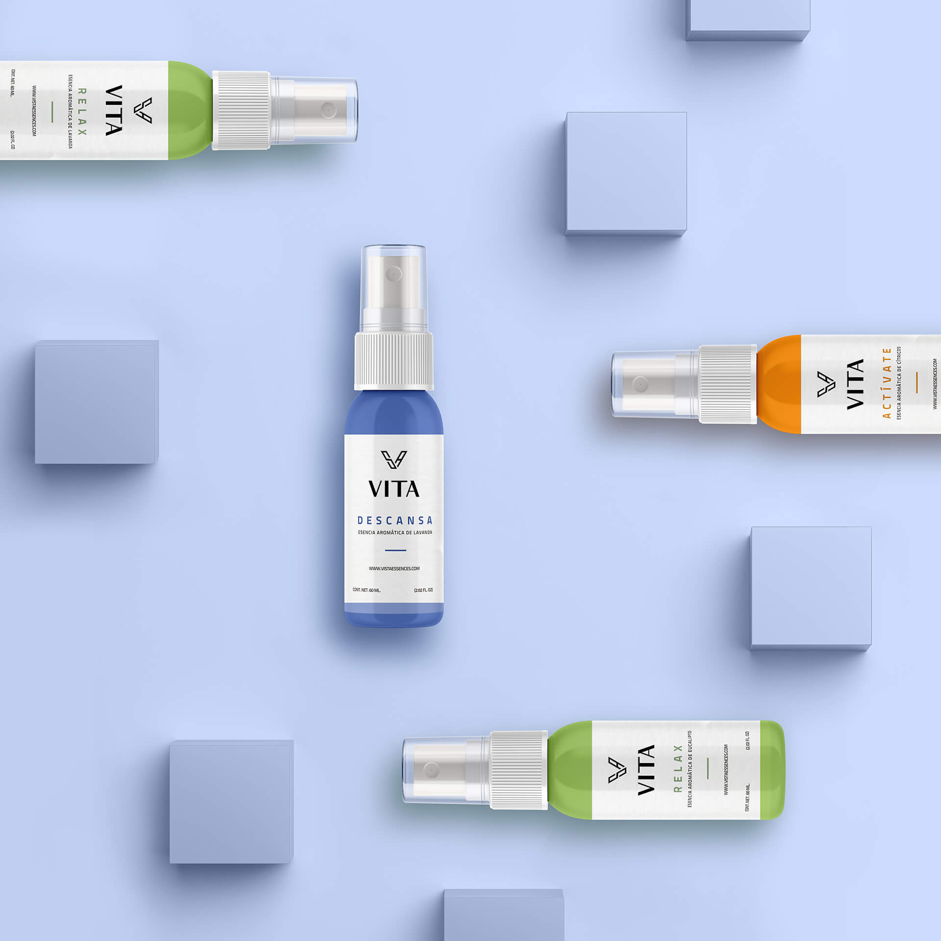 包装上的植物图案采用了黑白线条绘制,简洁而富有艺术感。橄榄、薰衣草等植物图案与香气相呼应,让消费者仅看包装就能联想到系列的天然成分和独特香味。文字设计上,“VITA”名称以简洁的字体呈现,下方“Essences by Susy Almeida”的字样则增添了一份专业与精致感。不同功能的系列通过不同颜色的色块和对应的文字标识来区分,如“ACTIVATE”“DESCANSA”“RELAX”,清晰明了,方便使用者快速找到自己需要的用品。