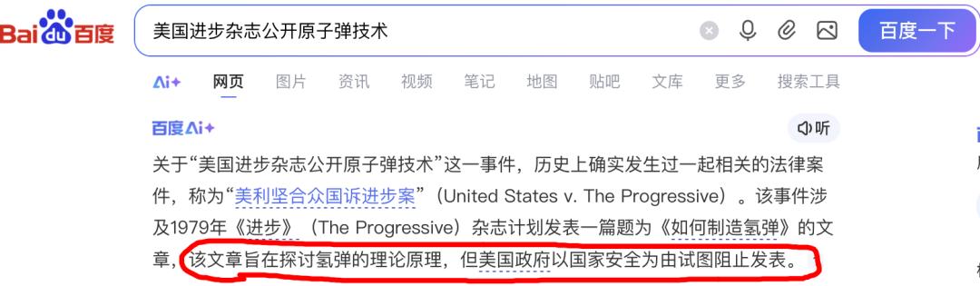 但结果是,绝对不能禁止。这就是美国人的执着,恐怕一大部分中国人都无法理解。说什么话是别人的权力,信不信和做什么事,则是你自己该思考的问题。我在另一本书里看到过如出一辙的事情,说美国有个进步杂志的创始人,他原本是个搞技术的,所以认为自由包括自己有权公开武器技术。这在我们看来,简直是疯了。但在美国,同意和反对的双方吵得不可开交,美国政府的态度当然是严禁公开,结果闹上了最高法院。中间过程非常曲折,我不细说了,但最后的结果是一些美国的普通人不服法院的禁令,跑去自己研究相关书籍、资料,然后纷纷发表自己解析出来的氢弹核心技术,导致政府只能放弃,并表示“禁止,已经没意义了。”