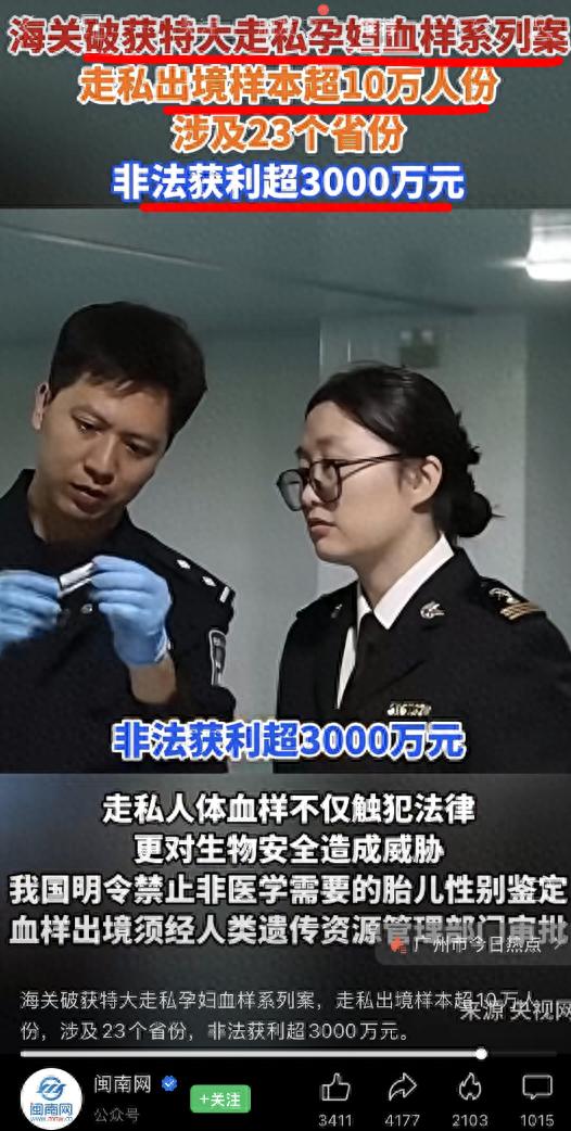 “海关破获特大走私孕妇血样系列案,走私出境超10万人份,涉及23个省份,非法获利超3000万元。。”