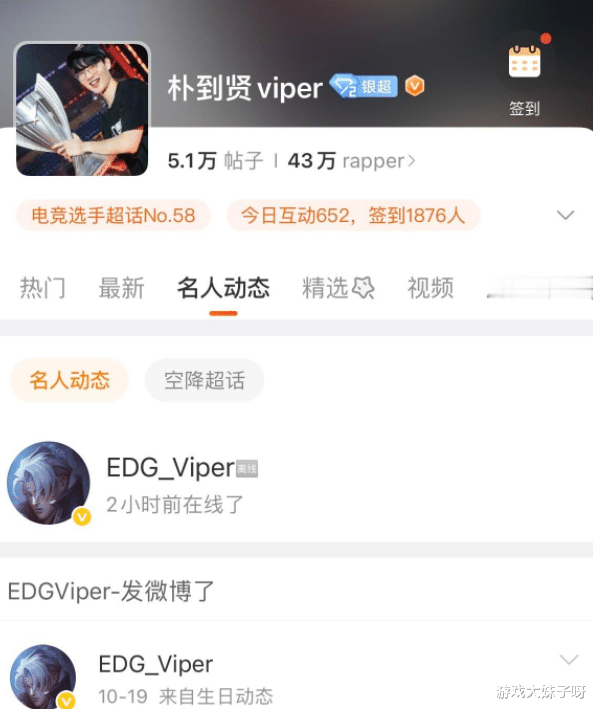 不过,与官宣同样热闹的,还有网友们发现的一个细节——在官宣发布之前的几天,Viper频繁地进入自己的超话浏览,这个操作被眼尖的网友瞬间截获,引发了一连串调侃:“哥这是提前来考察民意?”“加入之前先看下风评,挺谨慎啊。”“这是怕来到LPL被网友冲吗?哈哈哈太可爱了。”“这波是先看看LPL网友的‘难度系数’。”