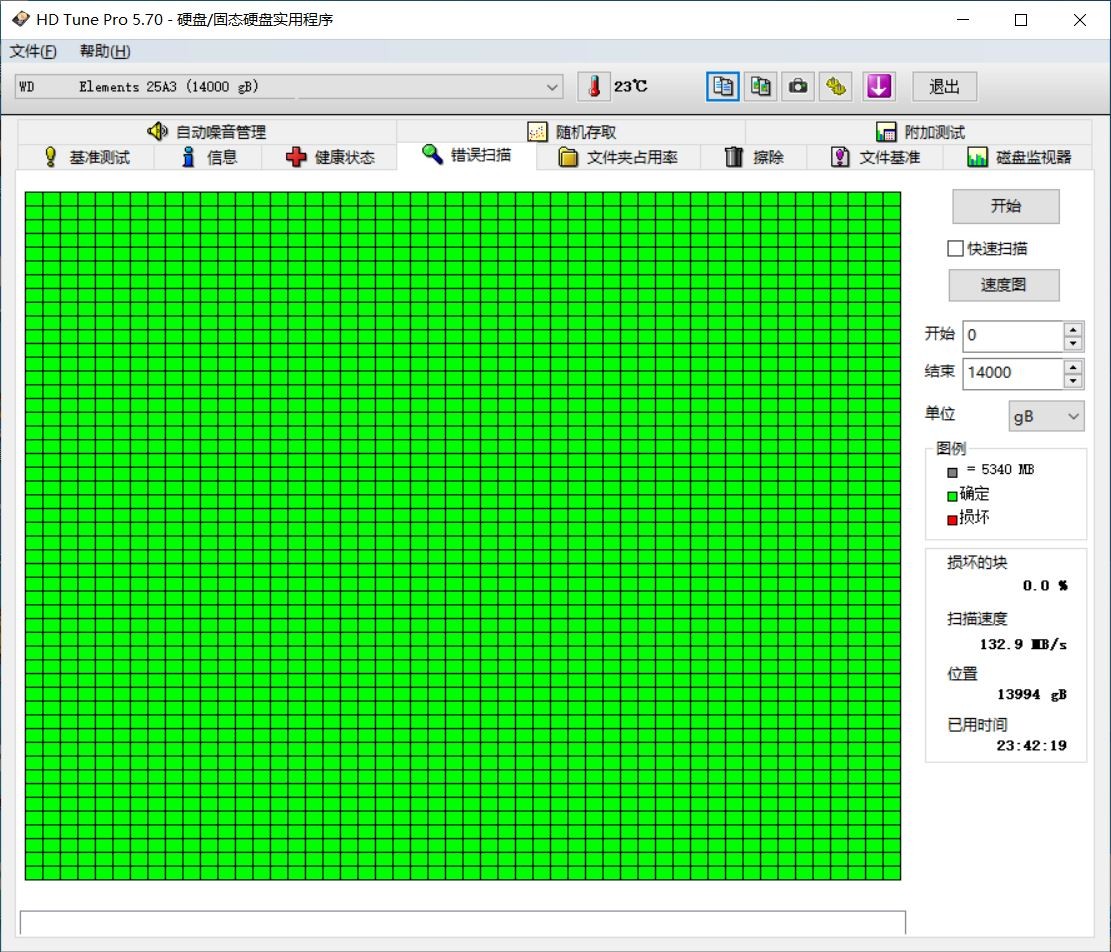 接下来开始错误扫描,一开始速度有208MB/s左右,越后面越慢。总共耗时23小时42分19秒。还好全盘都是绿的,悬着的心终于是放下了。