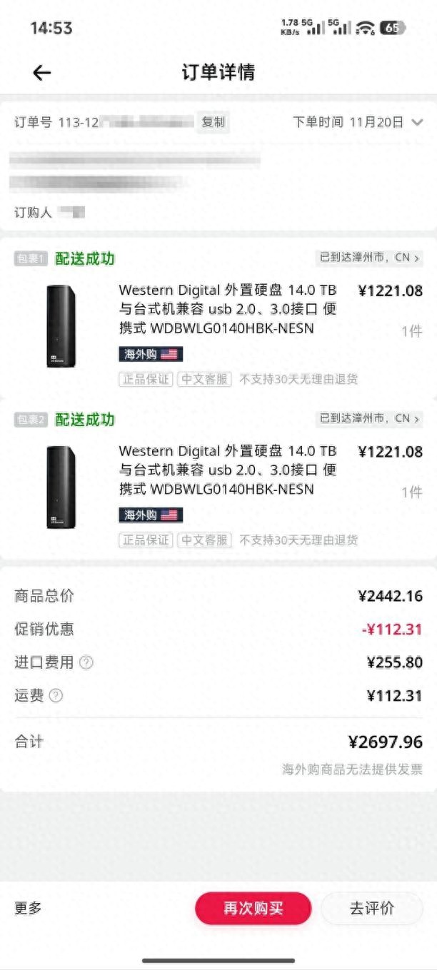 最近硬盘猛猛涨价,前阵子帮朋友装机,一个2T机械盘的才500,最近一看,1T的639,真心无语。二手机械盘的价格也翻倍了,之前700左右如今也快1400了,实在是有点下不了手。正好黑5的时候,亚马逊有些款式价格很不错。在值得买看到20T的西数红盘RED Pro价格还不错,去亚马逊看已经没货了。然后又看到了西部数据元素系列14T桌面移动硬盘(以下简称:西数元素盘14T),价格真心不错,售价1221.08,税费127.9,到手1348.98,也就是1T不到100。问了个哥们,也想买,那就一起下单了2个。11.20下单,预计12.8到,实际11.30就到了,速度还行。