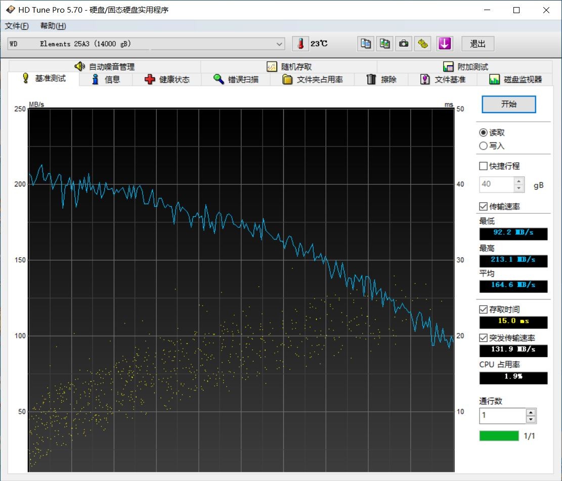 最后顺便跑了一下基准测试,最高213.1MB/s,最低92.2MB/s,平均164.6MB/s,突发传输速度131.9MB/s,存取时间15ms,CPU占用率1.9%。