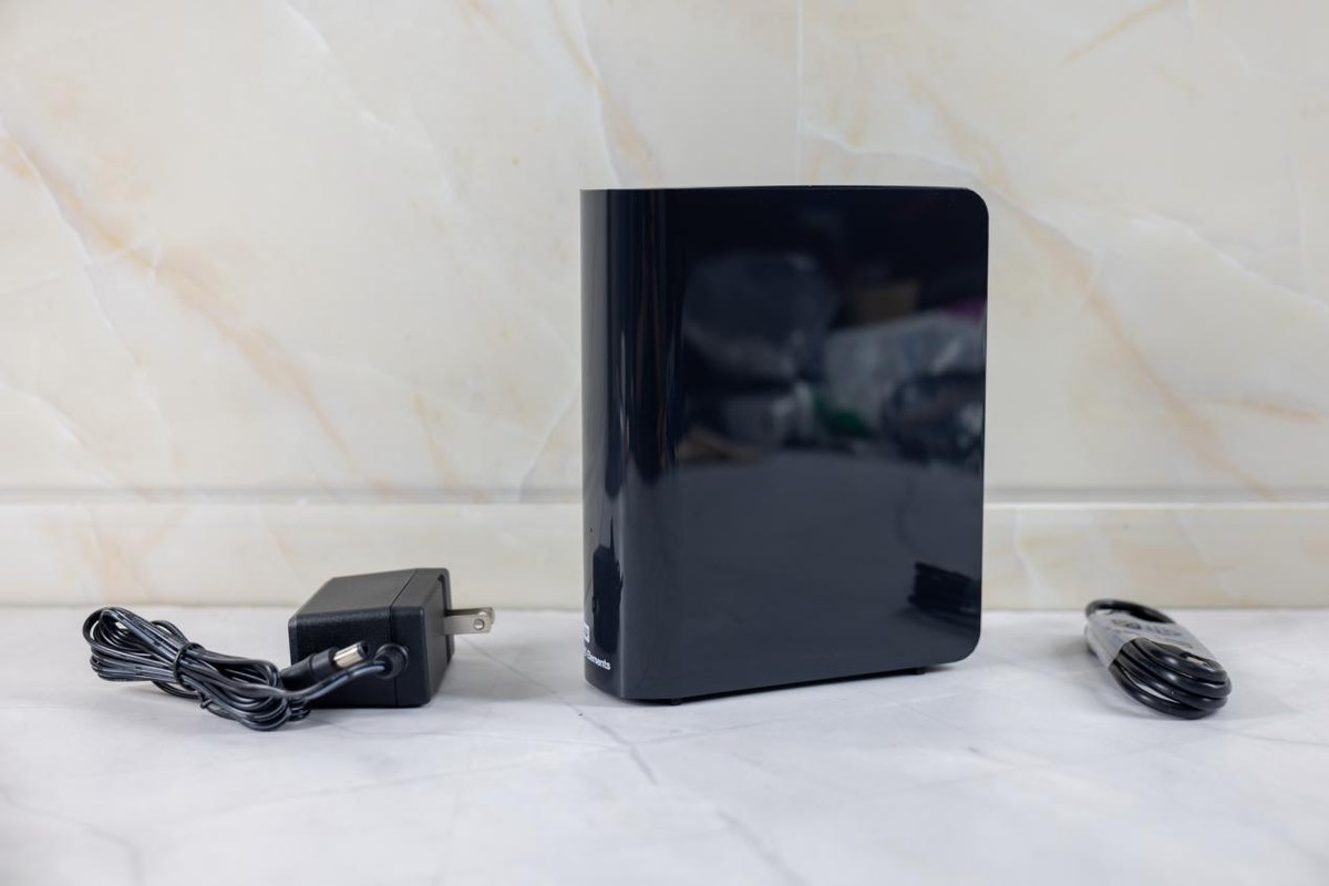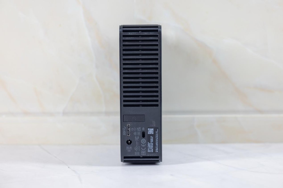 背面的上方是散热栅格,下方设计有一个电源开关,往下左边是Micro-B USB3.0接口,DC电源接口,右侧则是Kensington安全锁孔。再往右贴有一张铭牌标签,可以看到这块西数元素盘14T是泰国产的。