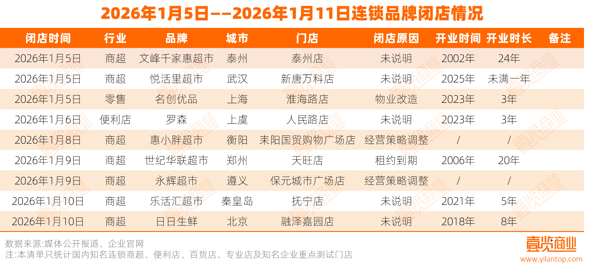 据壹览商业不完全统计,2026年1月5日——2026年1月11日,国内知名连锁商超、便利店、百货店、专业店及知名企业重点测试门店,共有9个连锁品牌关闭了至少9家门店。