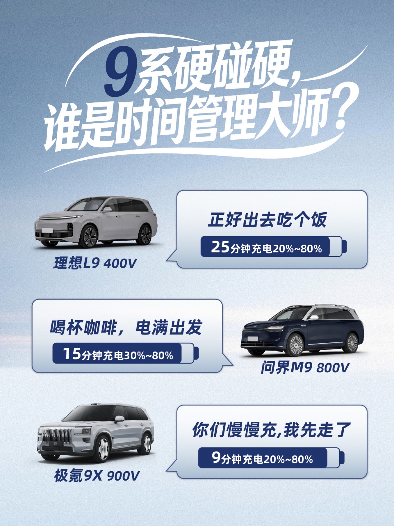⚡9系充电段位大PK!实测差距惊到我理想L9:吃顿饭=25分钟⏳问界M9:喝杯咖啡=15分钟☕极氪9X:刷个朋友圈=9分