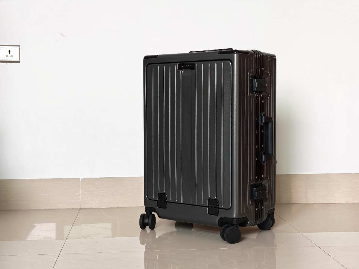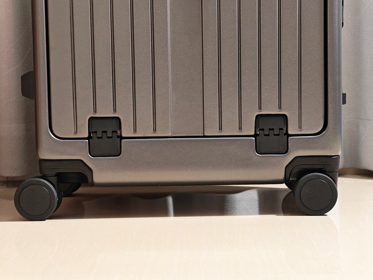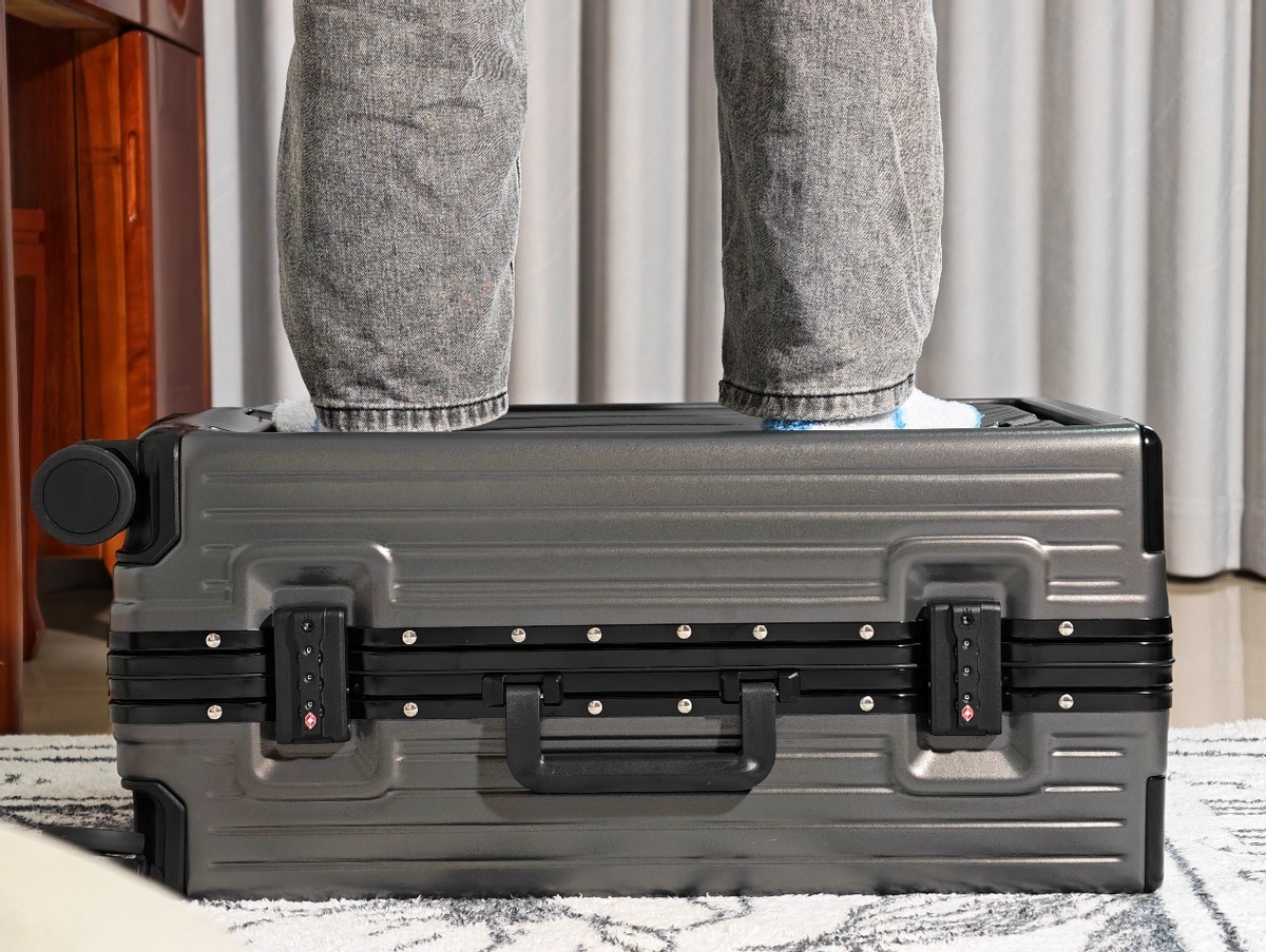 但GaKior行李箱却选择了一条相反的路:它采用四层德国进口科思创材质叠加,宛如为箱体穿上复合装甲;双层铝框开合设计+航空级铝合金合页,连拉杆、包角、轮子轴承、这些核心受力点也全部使用金属,杜绝了塑料件的断裂风险。