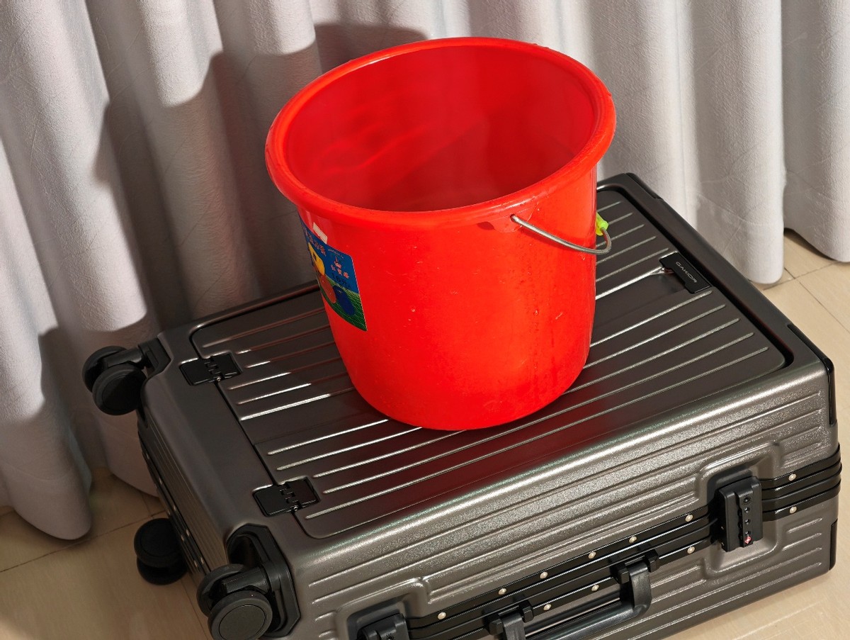 首先是承重测试:将空箱平放,直接在空箱中间压上一大桶水,可以看到中间有点凹陷,但丝毫没有要断裂的迹象,在静置一小时后移开,箱体中间直接恢复原状,按压时也感觉不到形变,这品质是真可以。