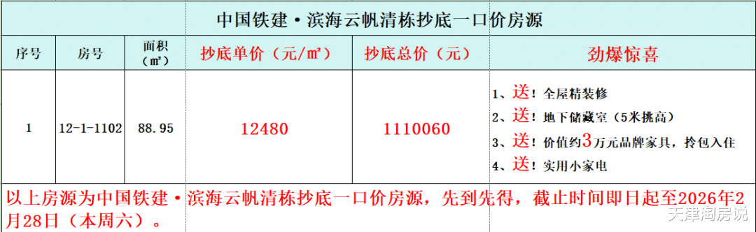 【塘沽】中国铁建滨海云帆,小高层89平米推出一套特惠房,总价111万。