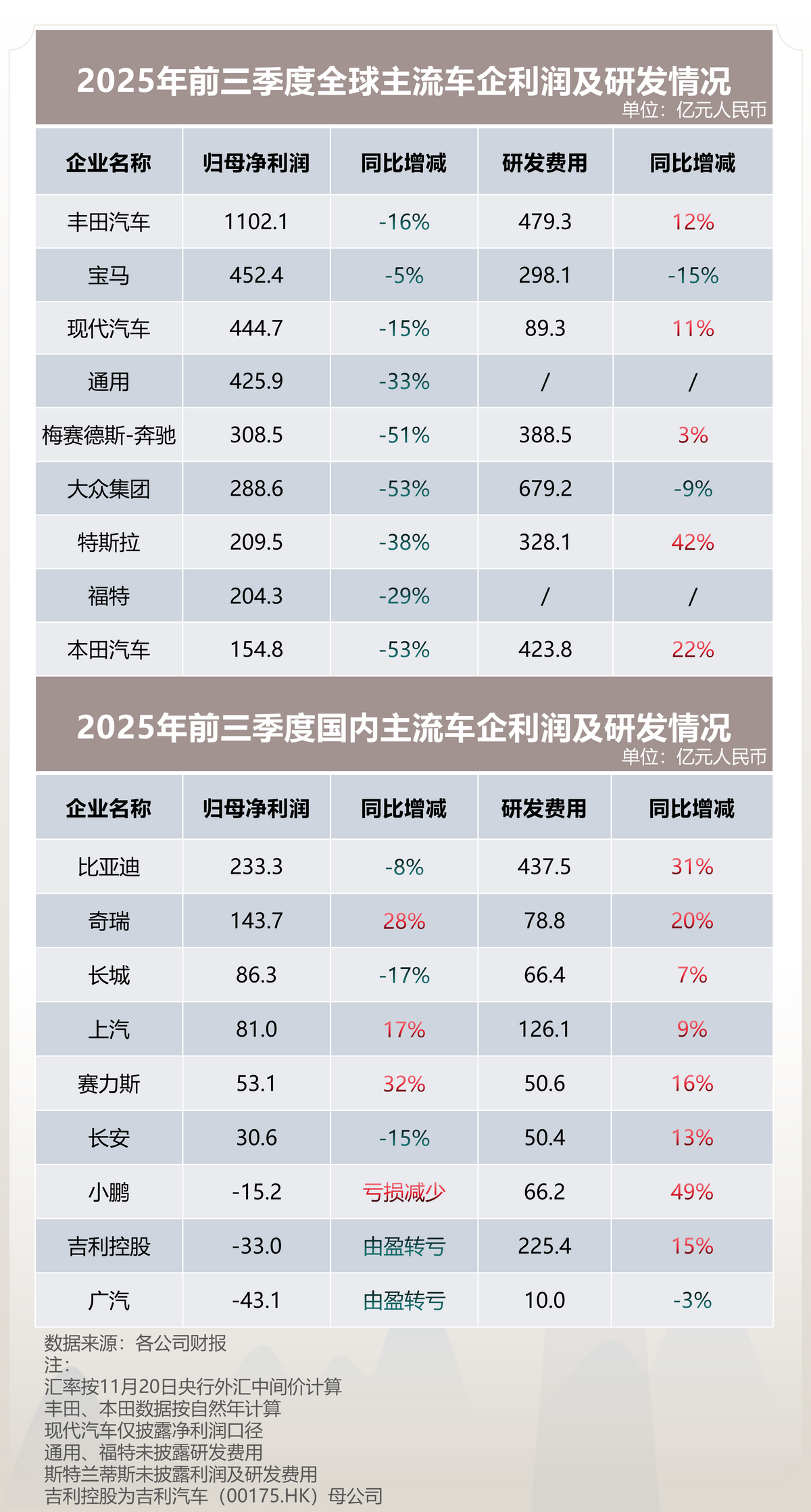 盈利表现的差距进一步印证了行业格局的变迁。受美国关税政策冲击、中国市场销量下滑等多重因素影响,海外车企净利润遭遇 “滑铁卢”:奔驰、大众、本田的利润降幅超 50%,即便是全球利润最高的丰田,净利润也下降了 16%,盈利承压明显。反观中国头部车企,盈利韧性令人瞩目,比亚迪、奇瑞前三季度净利润均突破百亿元大关,在市场调整期依然保持了强劲的盈利能力。