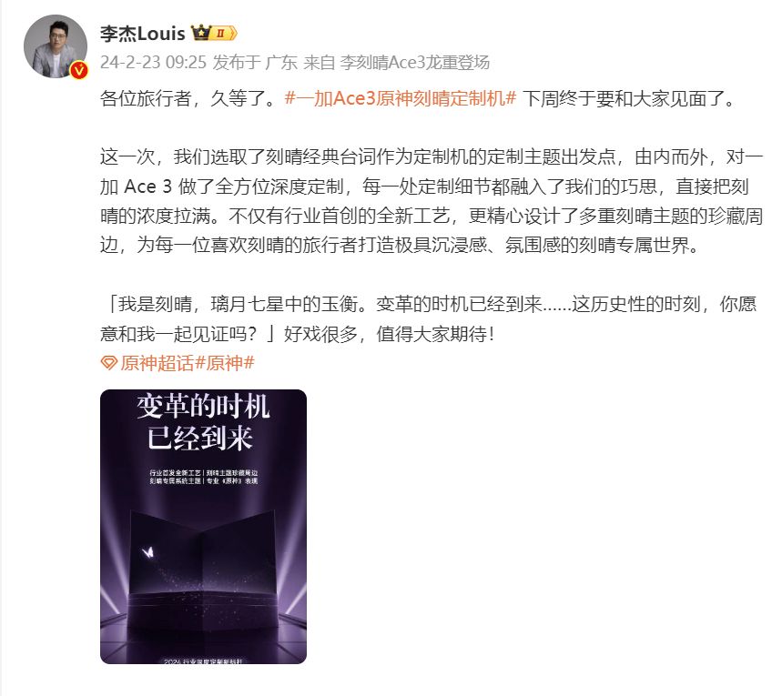 2月23日,一加官宣,一加Ace 3《原神》刻晴定制版将于下周发布。