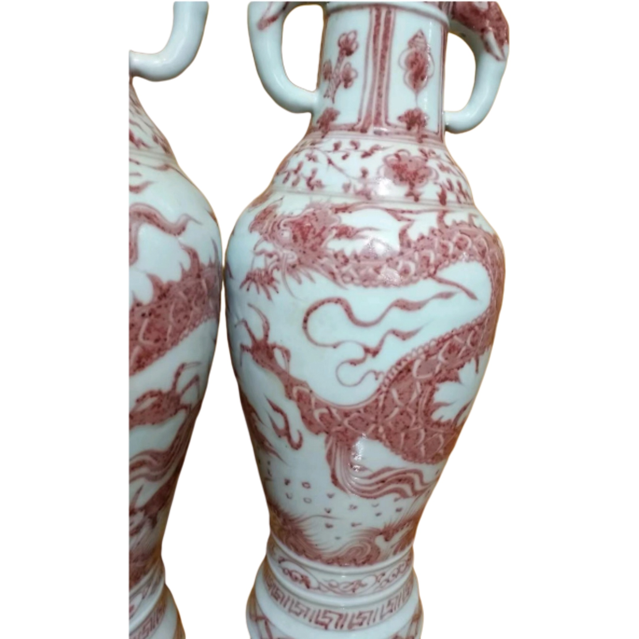 在瓷器的浩瀚世界里,有这样一对器物,以其独特的魅力,跨越数百年时光,依旧散发着夺目的光彩,它就是釉里红龙纹盘口象耳瓶。当目光触及这对高 61 厘米的瓷瓶时,仿佛能穿越时空,回到那个窑火熊熊、匠人心血交融的年代。