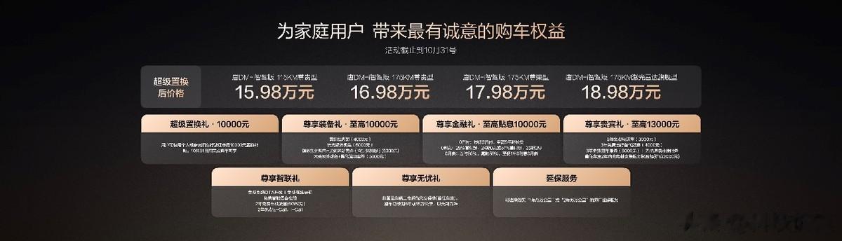 此次,唐DM-i智驾版 175KM长续航版共推出3款车型,售价17.98万~19.98万元(10月31日前完成购车可享10000元置换补贴)。同时,比亚迪还为用户准备了包含置换补贴在内的至高价值4.3万元盛唐礼遇。