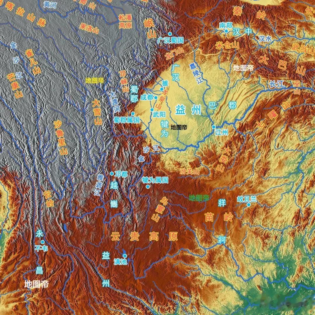 益州的核心是四川盆地,还包括汉中、云贵高原、横断山脉等地,主要是今四川、重庆、云南、贵州,以及陕西南部和缅甸东北部。