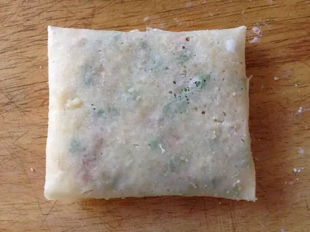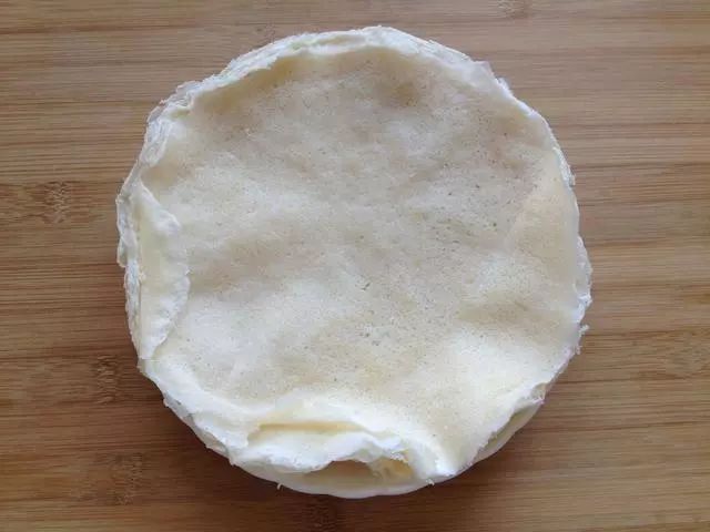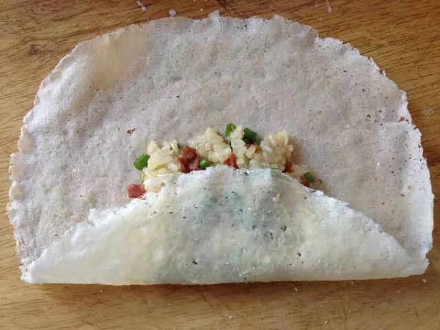 然后开始做饼胚,取一张春卷皮平铺在案板上,用刷子在春卷皮表面薄薄刷一层清水,这样可以增加粘性,让饼层更紧实。接着取第二张春卷皮,整齐地叠在第一张上面,再刷一层清水,继续叠第三张,一般叠3-4张春卷皮为一组,这样做出来的饼既有层次感,又不会太薄容易破。叠好后,在春卷皮的中间位置放上适量炒好的馅料,注意不要放太多,不然卷的时候容易露馅,大概占春卷皮面积的三分之一就可以了。如果加芝士片,就把芝士片放在馅料上面,再用勺子轻轻按压一下,让馅料更平整。