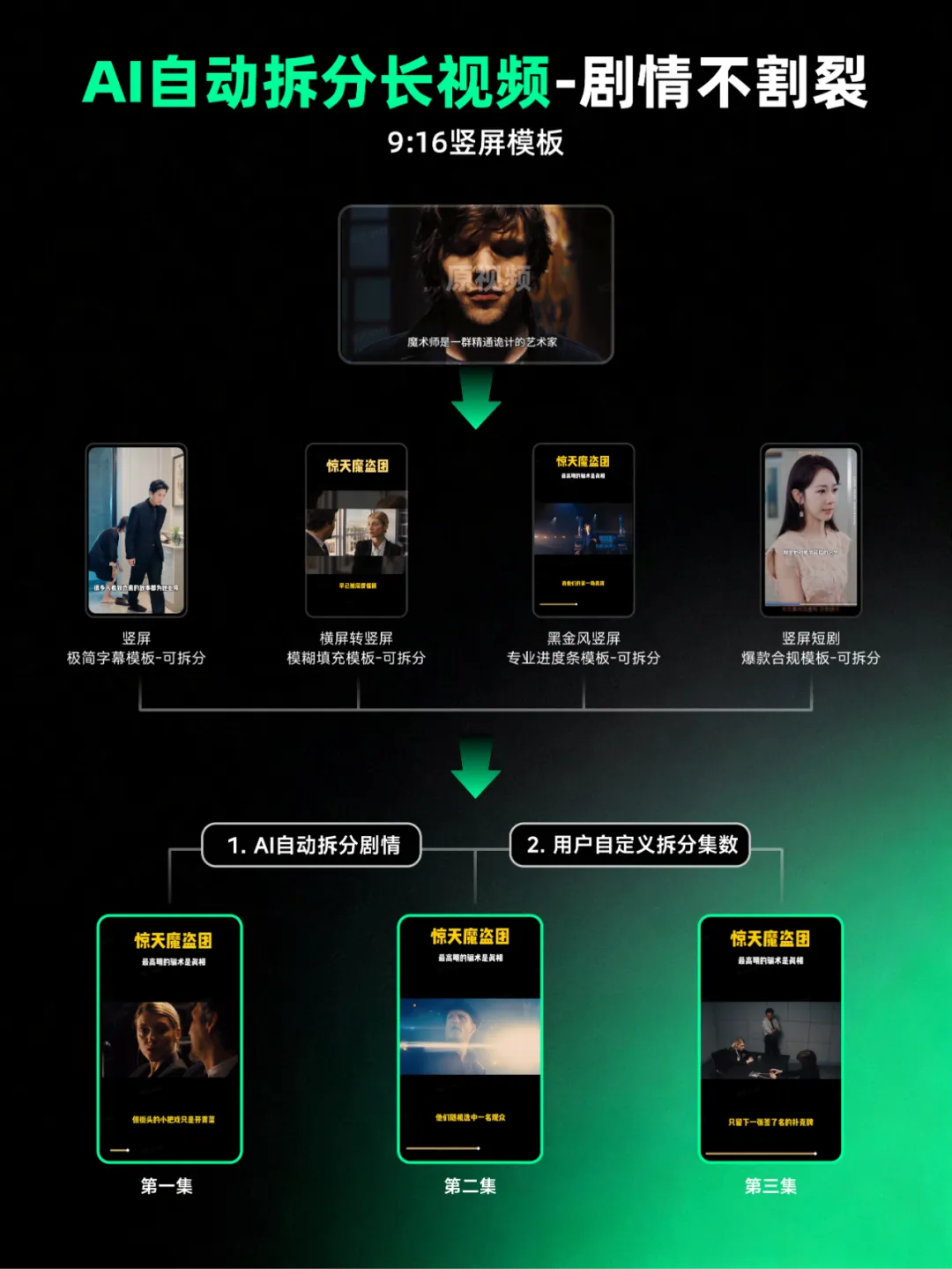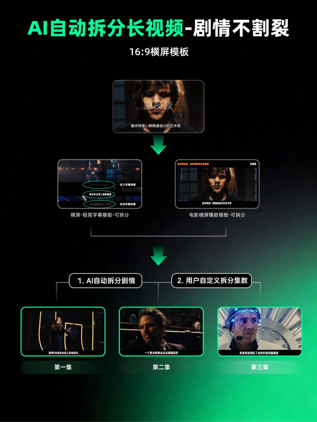现在的做法: 👉 选择可拆分模板 → 告诉我们你想拆分成几集 → AI****自动切分成片
