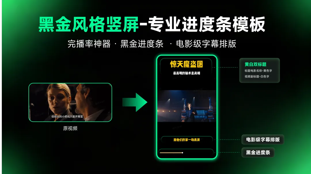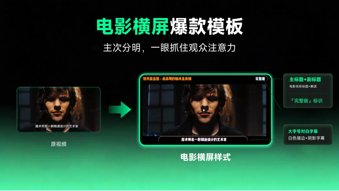 电影级排版: 左侧原片,右侧大字号信息区。解决了横屏视频在手机上字太小看不清的痛点,主标题+剧情解读一目了然