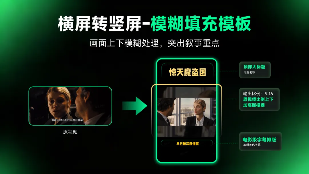 消灭黑边: 很多电影是16:9的宽画幅,放到短视频平台里上下全是黑边,显得很空洞。模板采用“高斯模糊”特效,抓取原片色彩自动填充背景