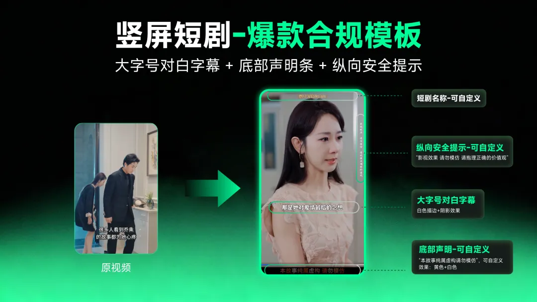 防违规设计: 顶部自动生成剧名,底部自带“纯属虚构”黄色免责声明,侧边植入纵向安全提示