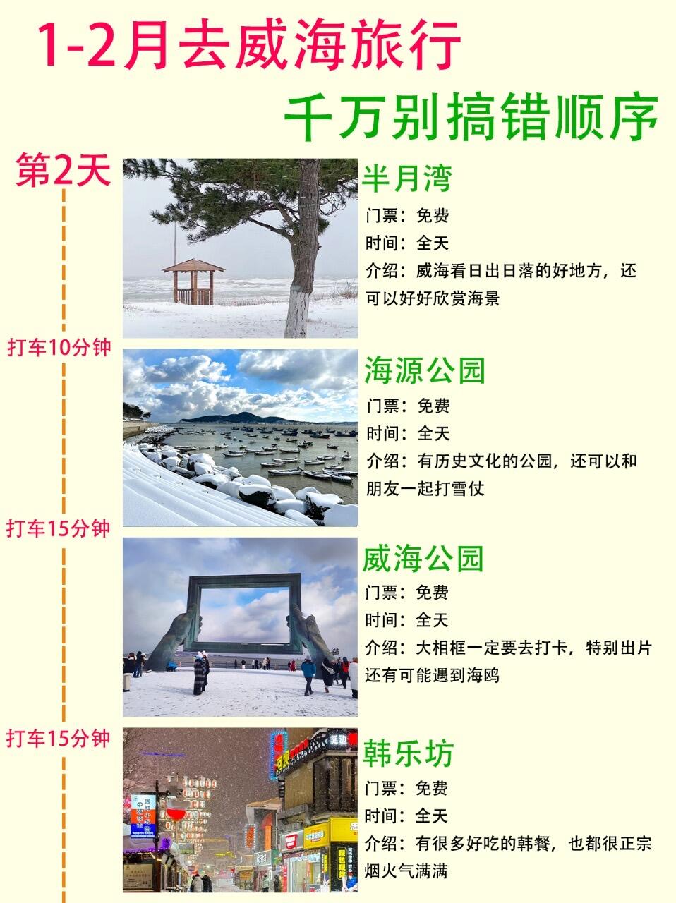 第二天主打看景!半月湾看海超绝🌊 海源公园还可以打雪仗,威海公园的大相框必拍📸!晚上就去了韩乐坊吃点韩餐。