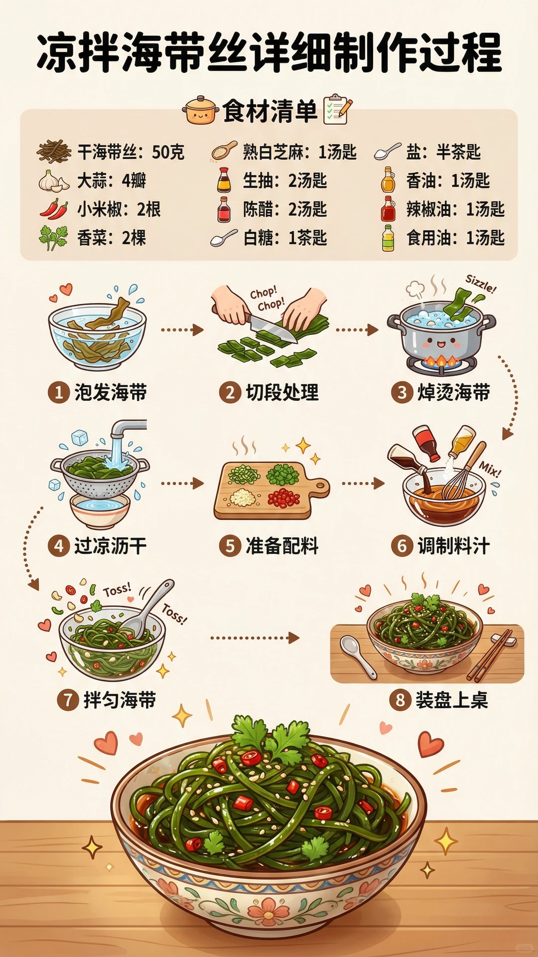 主料:干海带丝50克🟤,或新鲜海带丝200克。配料:大蒜4瓣🧄,小米椒2根🌶️,香菜2棵🌿,熟白芝麻1汤匙⚪。