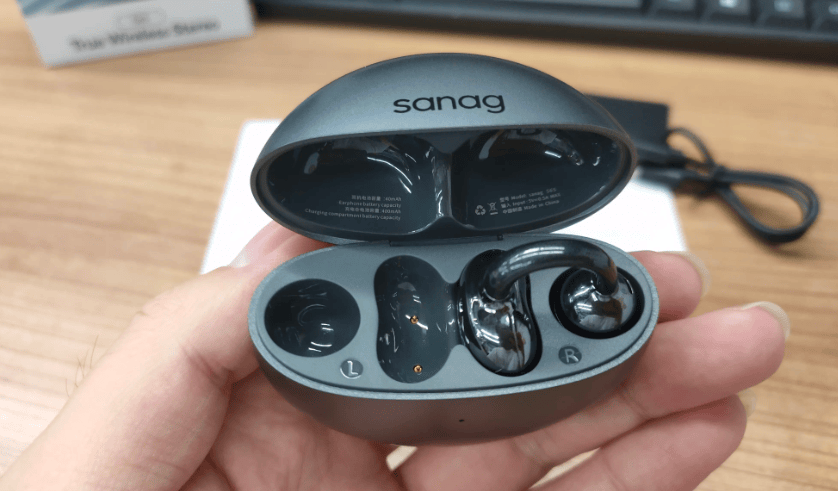 声阔AeroClip的充电盒是方形磨砂设计,手感扎实很有质感。耳夹结构偏宽大,C形桥的弹性一般,单耳重量约5.9g,佩戴稳定性很不错,跑步健身的时候戴着基本不会掉,但对于耳朵偏厚的人来说,夹耳感会比较明显。