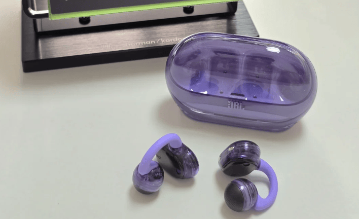 JBL琉璃扣的半透明耳机盒设计辨识度直接拉满,内部结构看得一清二楚,科技感和时尚感直接拿捏。耳机采用C形弹性桥结构,外层包裹着柔性TPU材质,佩戴稳定性还不错,但因为单耳重量稍微偏大,长时间戴的话会有一定夹耳感,更适合短时间佩戴使用。