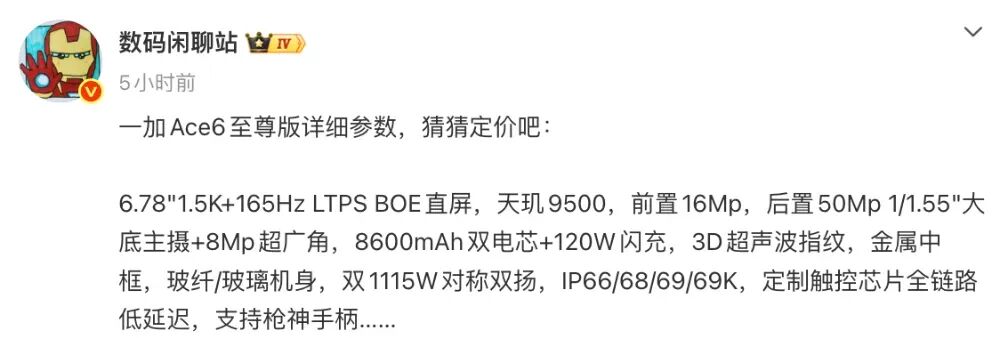 今天,博主@数码闲聊站 曝光了一加Ace6至尊版的详细参数。
