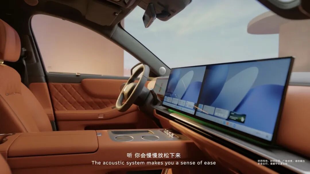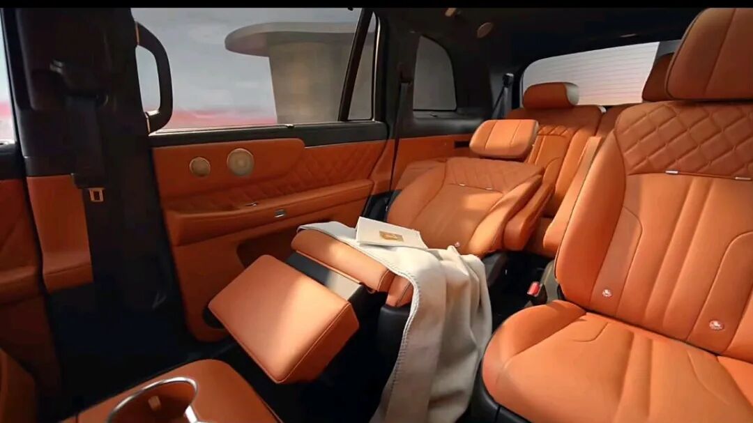 内饰配色为橙红色+灰色双拼,采用怀挡设计,前排大屏、仪表盘设计与蓝山类似,但整体线条比蓝山内饰要偏硬朗一些,二排空间带有吸顶娱乐屏,包括小桌板也给到了。
