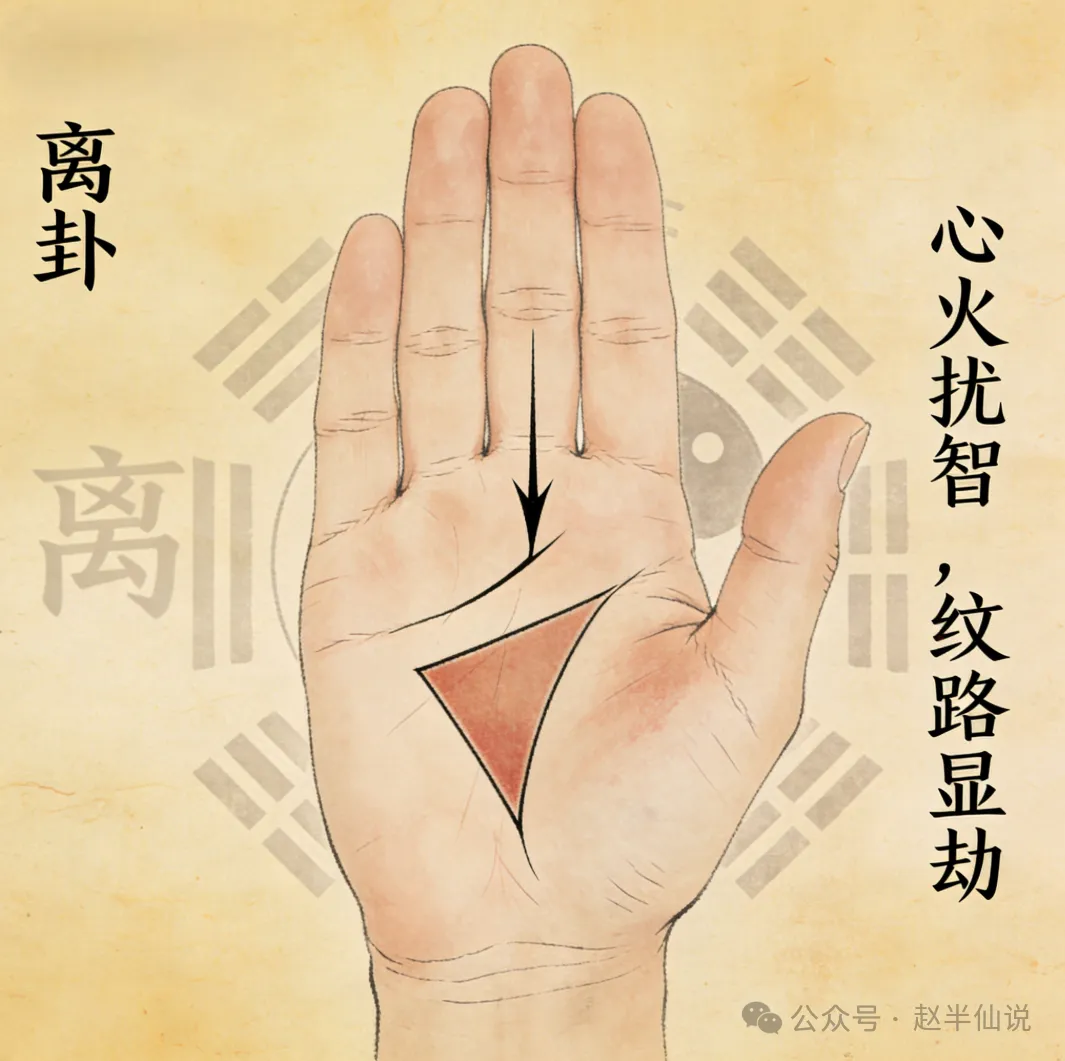 他依言伸出右手。掌心软绵,纹理清晰,生命线绵长,智慧线深直,是典型的“文人掌”,主一生与笔墨结缘,心思通透。可怪就怪在,智慧线在中指下方突然分叉,一条继续延伸向腕间,另一条却斜斜切入感情线,形成一个尖锐的三角,像一把小刀子,扎在掌心。这是“心火扰智”的典型掌纹,心思被杂念裹挟,连智慧都要受牵绊。
