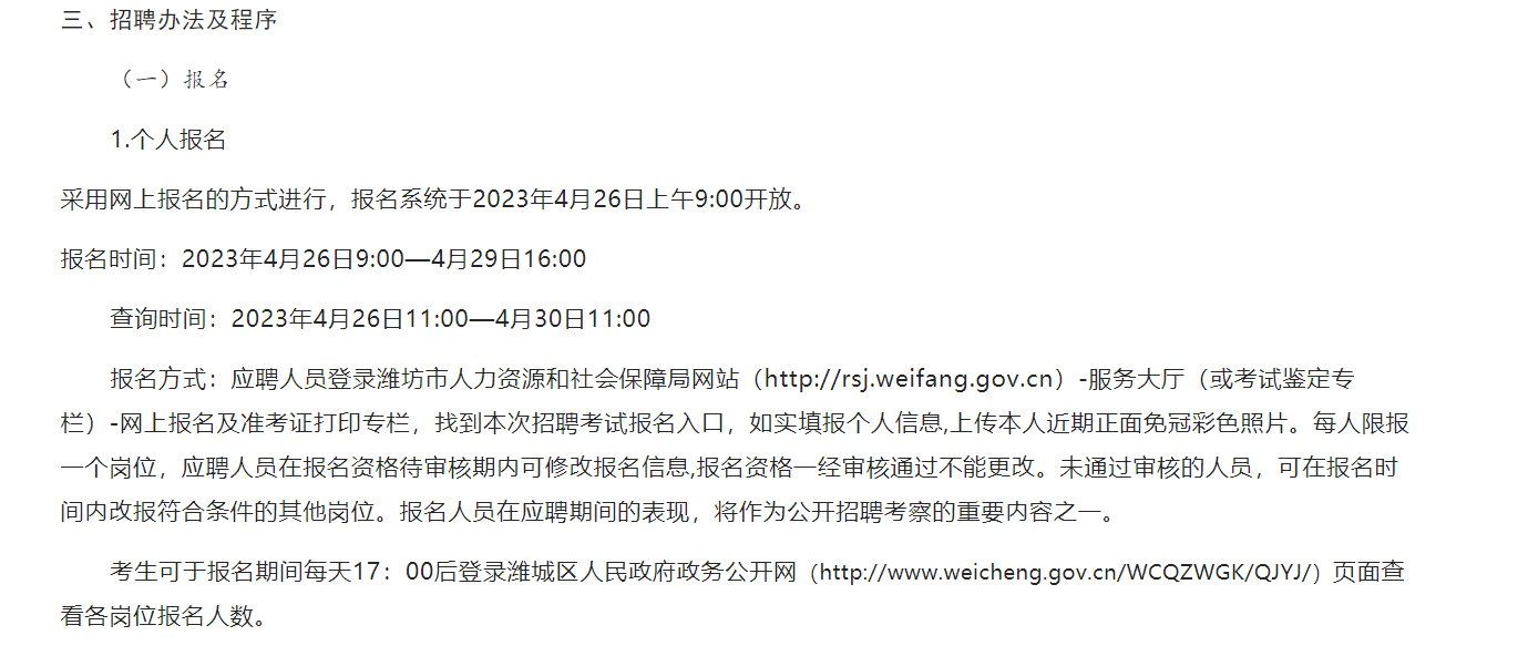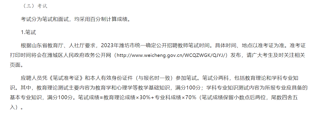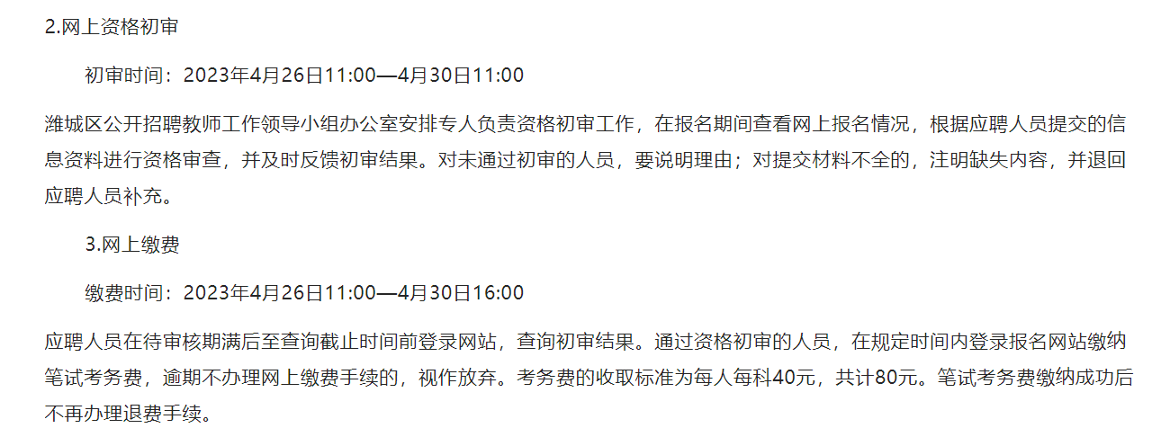 2023年潍城区公开招聘中小学、幼儿园教师公告(223人)报名时间:2023年4月26日9:00—4月29日16:00查询时间:2023年4月26日11:00—4月30日11:00初审时间:2023年4月26日11:00—4月30日11:00缴费时间:2023年4月26日11:00—4月30日16:00考务费的收取标准为每人每科40元,共计80元考试时间:以准考证为准