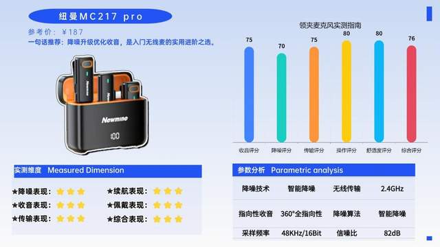 总体来看,纽曼MC217 pro收音专业、降噪强效、操作便捷,是影视制作团队、纪录片创作者的优选,能满足各类高端创作场景,性价比突出。