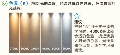 色温决定了光线的冷暖程度。护眼台灯的理想色温为4000K暖白光,接近清晨自然光。它既不会过冷导致眼睛疲劳,也不会过暖让人犯困,非常适合读写和学习场景。一些标注“暖白光”的台灯实际上色温可能高达5000K甚至更高,偏冷光,使用时容易造成眼睛疲劳,因此选购时需要注意色温参数。