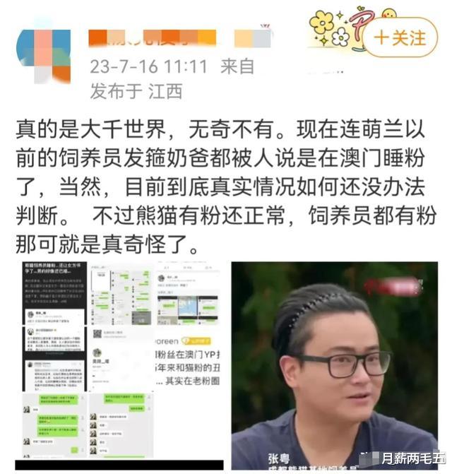 一些网友揭露了这名饲养员的身份,他是一名曾在萌兰熊猫基地工作的饲养员,因为常常亮相在公众视野中,他也成为了一名网红。这位姓张的饲养员有着长长的头发,经常戴着发箍,被网友们称为“发箍男神”。他在网络上颇受欢迎,拥有大量的女性粉丝。四十几岁的张先生看上去非常斯文,他已经结婚,然而,一位女粉丝却揭露了他的出轨行为,并声称她因此怀孕。在张先生照顾萌兰熊猫的那段时间里,他总是陪着萌兰,因此经常被网友们拍到,这也使得他的知名度有所提升。作为一名饲养员,张先生可以说是相当出名的人物了。
