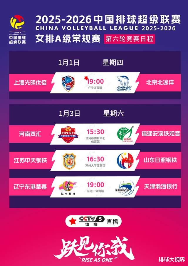 2025-2026赛季中国女排超级联赛第六轮,元旦这天安排了一场京沪大战!比赛时间1月1号晚上19:00,CCTV5计划直播本场对决!其他观赛渠道:央视体育客户端、中国排球超级联赛微博!A级别其他三场1月3号进行!