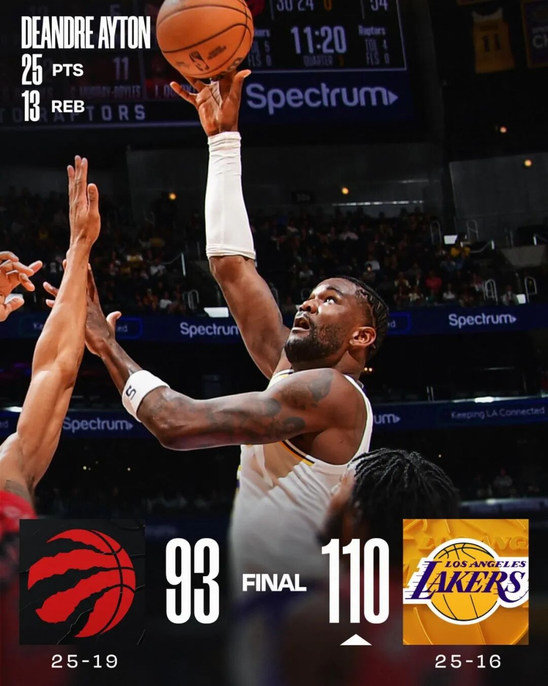 25分是艾顿加盟湖人以来的单场第二高分(此前拿过29分),他也成为了湖人队史第一个单场以100%命中率拿下25分10篮板0失误的球员。