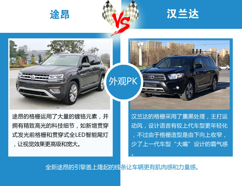 途昂的格栅运用了大量的镀铬元素,并拥有精致高光的科技细节,如新增贯穿式发光前格栅和贯穿式全LED智能尾灯,让视觉效果更高级和宽大。全新途昂的引擎盖上隆起的线条让车辆更有肌肉感和力量感。汉兰达的格栅采用了熏黑处理,主打运动风,设计语言有较上代车型更年轻化,不过由于格栅造型是由下向上收窄,少了上一代车型“大嘴”设计的霸气感。汉兰达虽然也运用了线条勾勒,但风格要更加收敛一些。