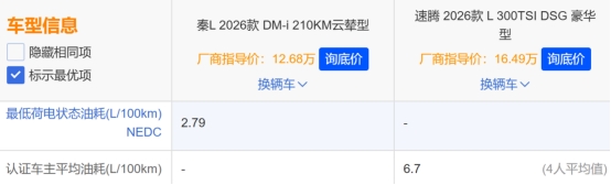 当然,并非所有用户都有条件安装家充桩,对于这类用户来说,比亚迪秦L和速腾L似乎站在了同一起跑线,但实际用车体验和成本依然存在明显差异。秦L即便使用混动模式,亏电油耗也仅为2.79L/100km,不充电、把它当一台燃油车来用,也能保持极低的用车成本。
