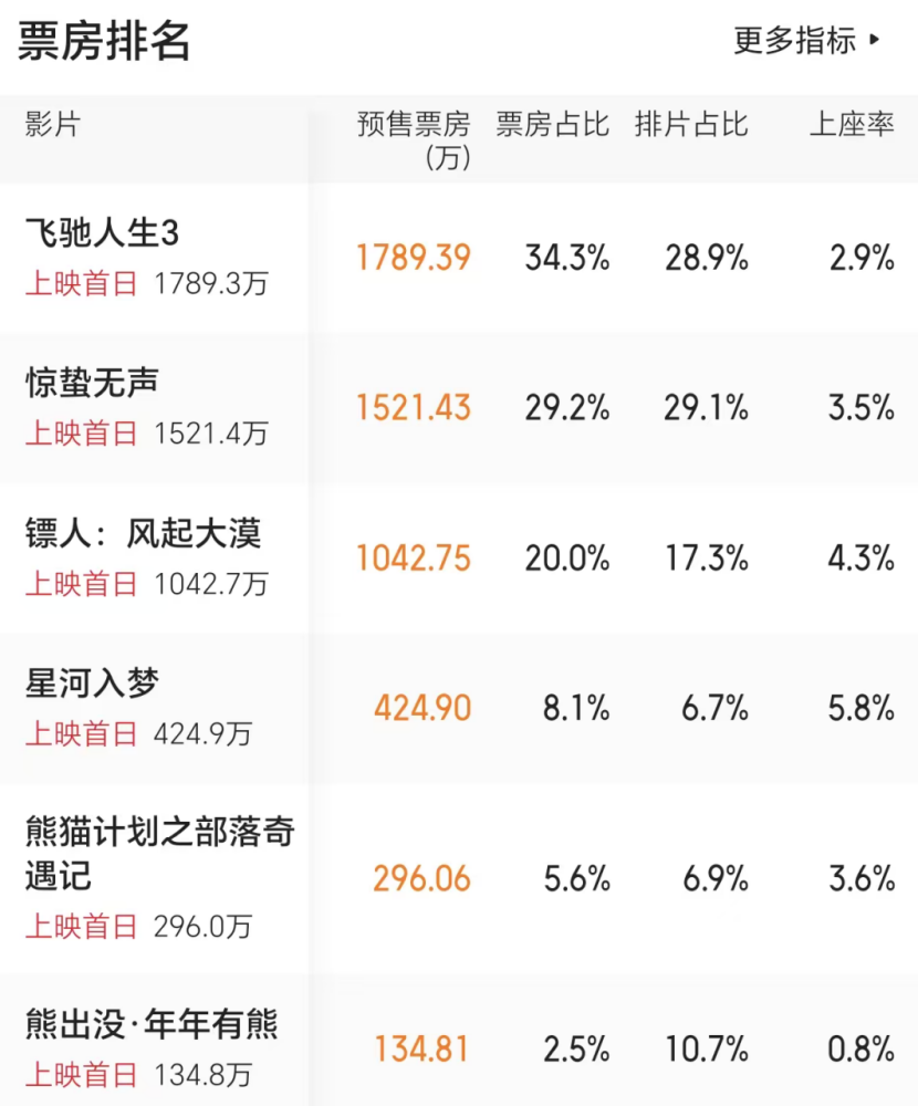 虽然《惊蛰无声》在票房上略逊一筹,但排片占比却是最高的,接近30%。