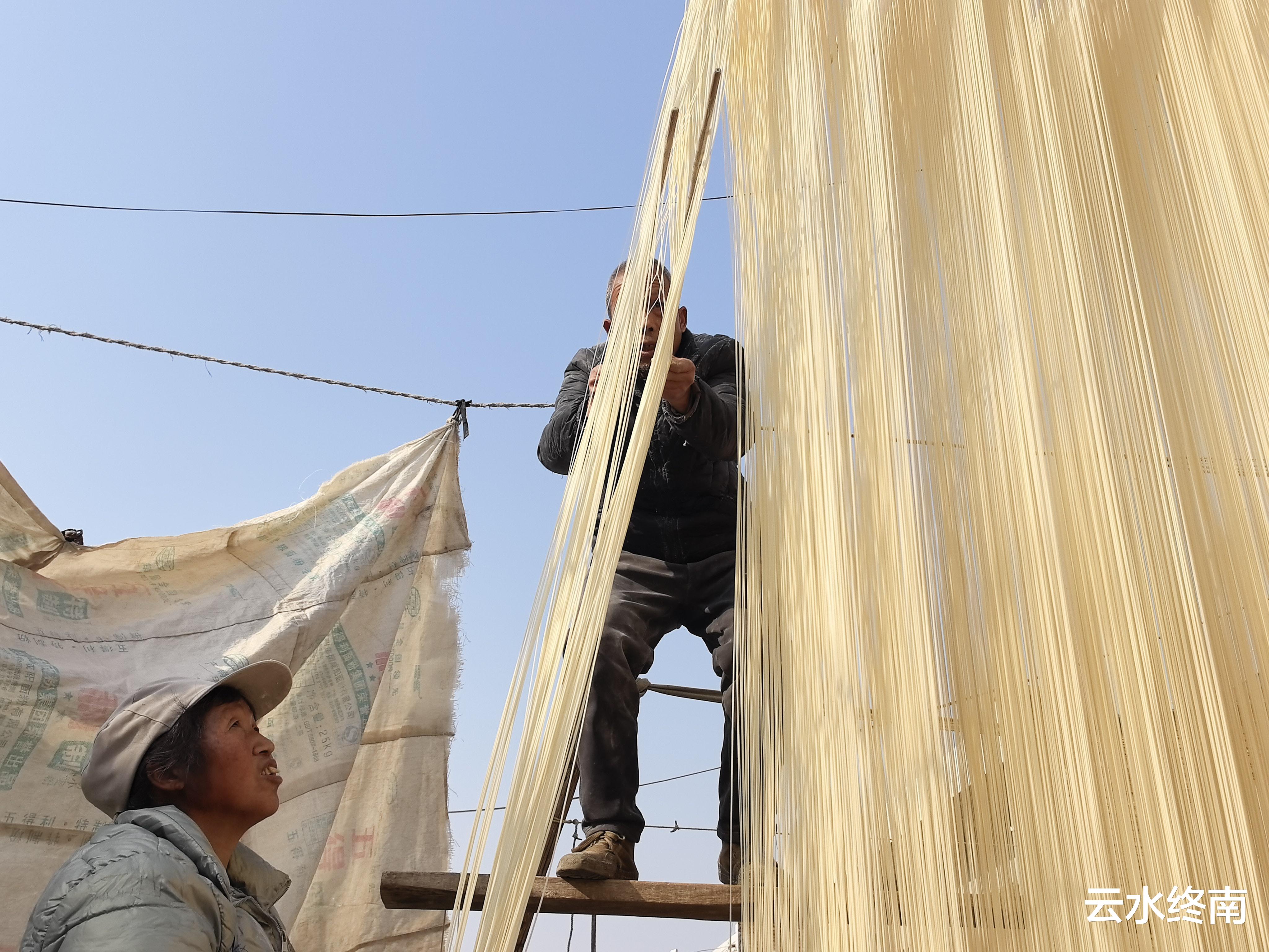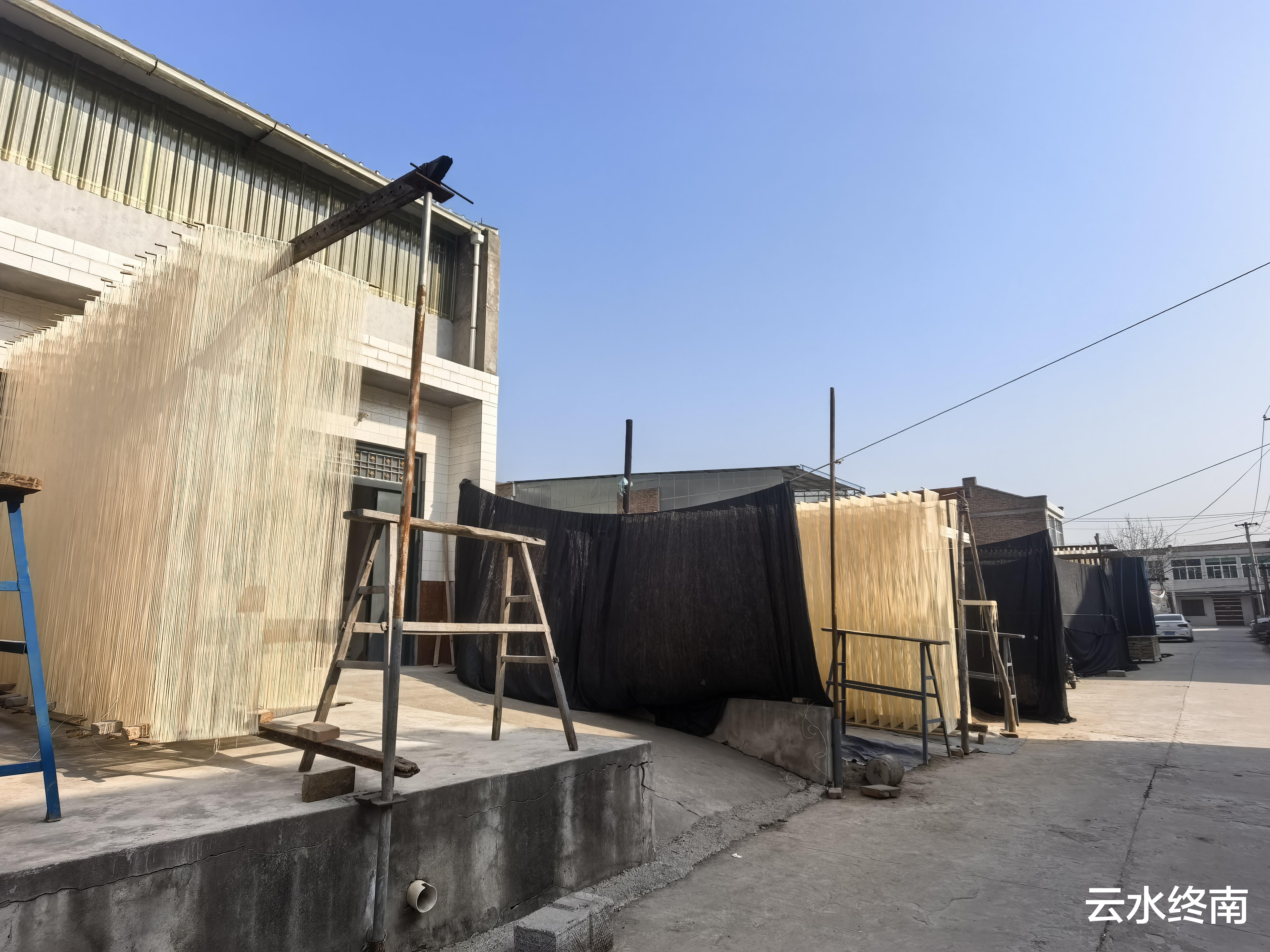 我来的时候,基本上也是村中最后一批挂挂面的日子。很多人家门前院后,都是银光闪闪,万千细丝扯连着天地。有了朋友的介绍,我对时下挂面了解的更多了。