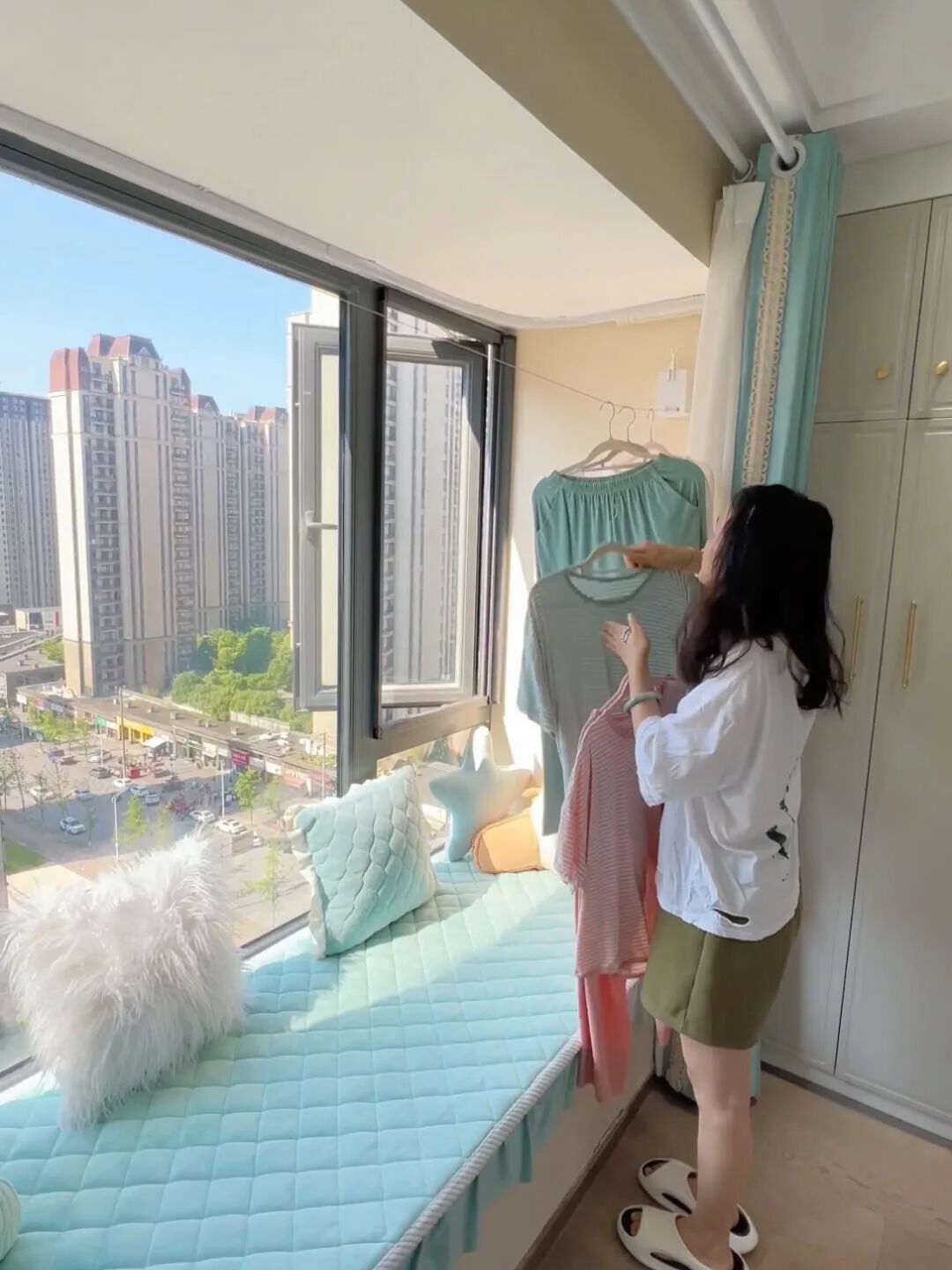 你看,晾衣服真不是只有“挂阳台”这一种选择。 我们总抱怨家里乱、不够美,却很少去想:是不是自己的思路被框死了?