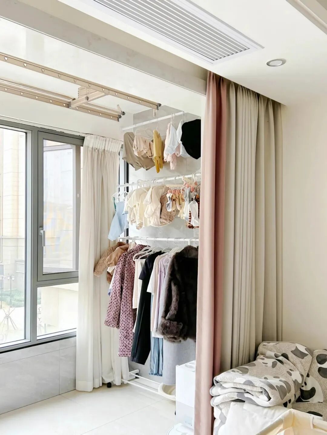 直到她笑着拉开侧面一道纱帘——好家伙,衣服整整齐齐挂在侧边,像被隐身了一样,客厅视野一点儿没挡,阳台还是那个精致阳台。